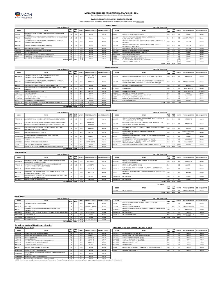 AR130 BUILDING TECHNOLOGY 1: BUILDING MATERIALS 3.0 - 3.0 None None AR152 HISTORY OF ARCHITECTURE 3 2.0 - 2.0 AR151 None
