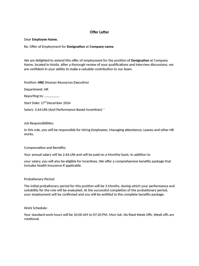 We are delighted to extend this offer of employment for the position of Designation at Company