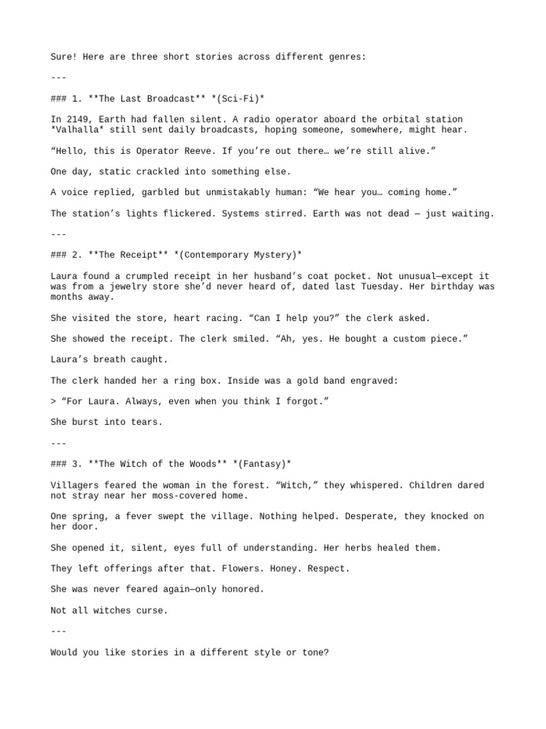 Here are three short stories across different genres: