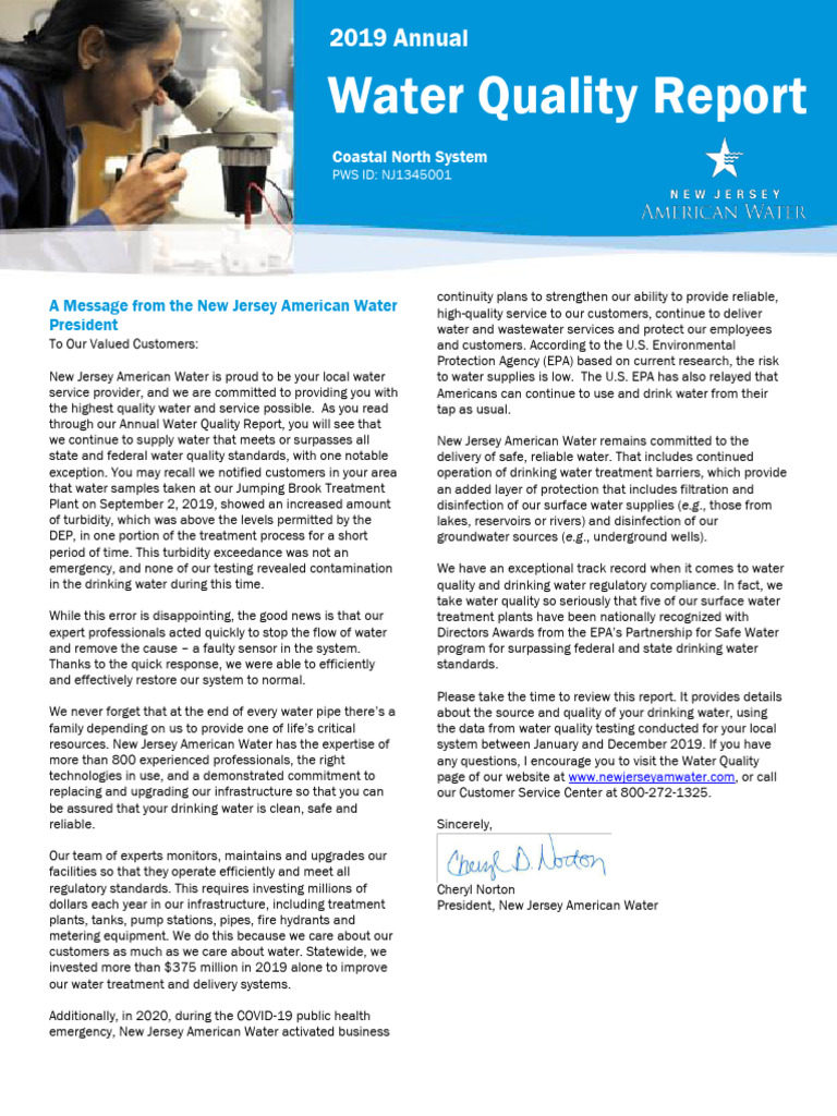 18, * New Jersey American Water routinely monitors your water for turbidity (cloudiness). This tells us whether we are effectively filtering the water supply. Our