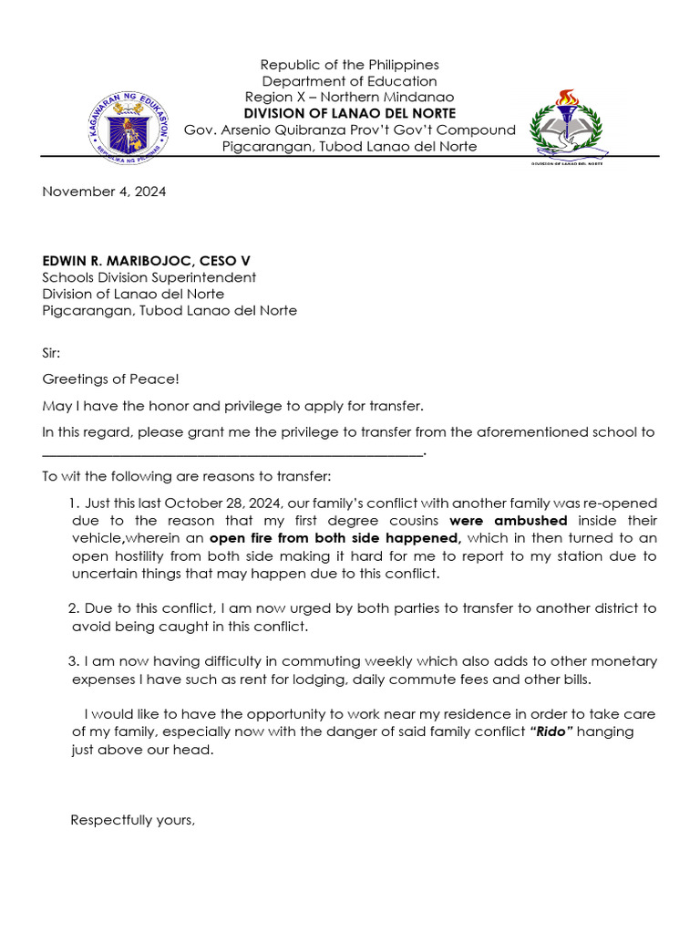 In this regard, please grant me the privilege to transfer from the aforementioned school to