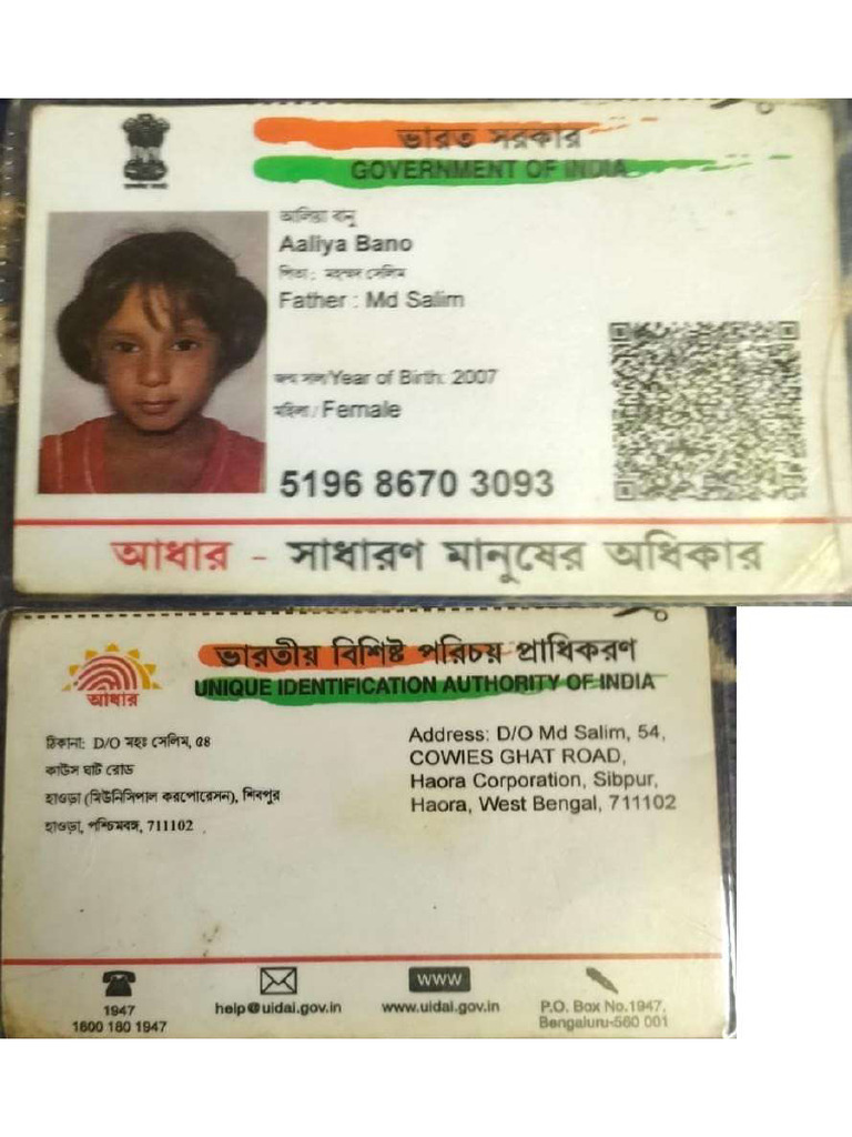The document contains personal information about Aaliya Bano, including her father's name, address, and contact details. It indicates that she is a female born in 2007. The document also includes an email and a website related to UIDAI.