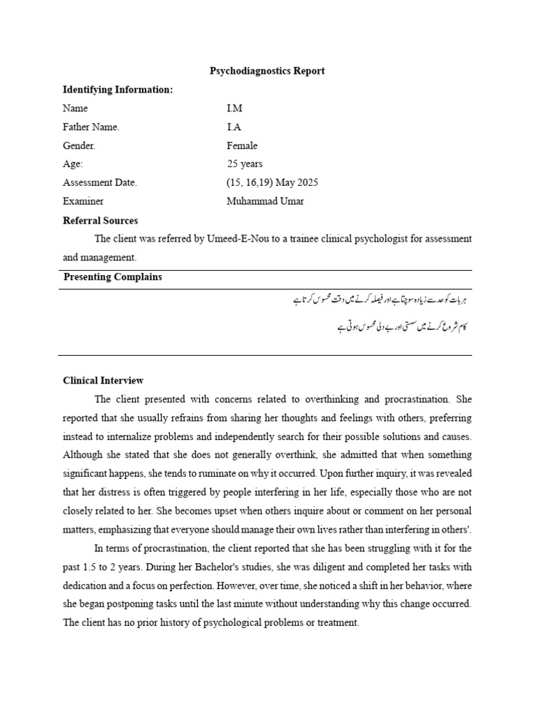 The client was referred by Umeed-E-Nou to a trainee clinical psychologist for assessment