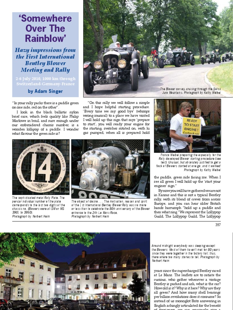 Guild, And . . . We wish to welcome you to Munchkinland. Sort of appropriate as Switzerland is 200 yards away from us on the far side of the Rhine. Our leader continues, When 17 blowers start I cant hear the one that hasnt started so once your engine is running hold up the green side and I will know all is well, otherwise show me the red side and we will render assistance to get you going. This is thoughtful and eases me over my harrumphing frisson (didnt Harrumphing Frisson drive for Delage?) as it dawns on me he has a point, as Blowers can be prone to the wheeze ngrind of sclerotic starting. More evidence of thoughtfulness, is in the three types of pen, highlighted maps, detailed directions, a small flask of alcoholic spirit, to be drunk while waiting for a St Bernard, and OH! The rally plate, its the best rally plate evaaaaaah. Not the usual cheery pastiche number plate, but an exquisitely machined plaque made 200 yards away in the land that gave us Piaget, IWC, Patek Philippe and the Nagra tape recorder. Most thoughtful of all 358