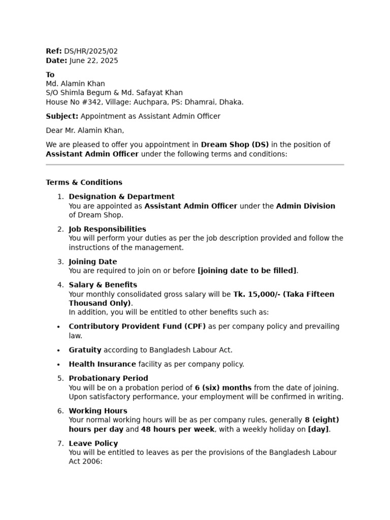 We are pleased to offer you appointment in Dream Shop (DS) in the position of