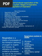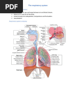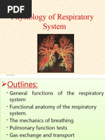 The document provides a comprehensive overview of the physiological anatomy and functioning of the respiratory system, detailing the components involved in respiration, gas exchange, and regulation. It covers respiratory volumes, capacities, and function tests, as well as the transport of gases and the mechanisms of respiration. Additionally, it discusses various respiratory diseases and their implications, including lung cancer, COPD, cystic fibrosis, and pneumonia.