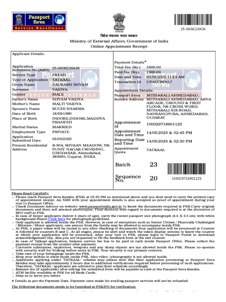 Application 25-0006226436 Total Fee (Rs.) 3500.00