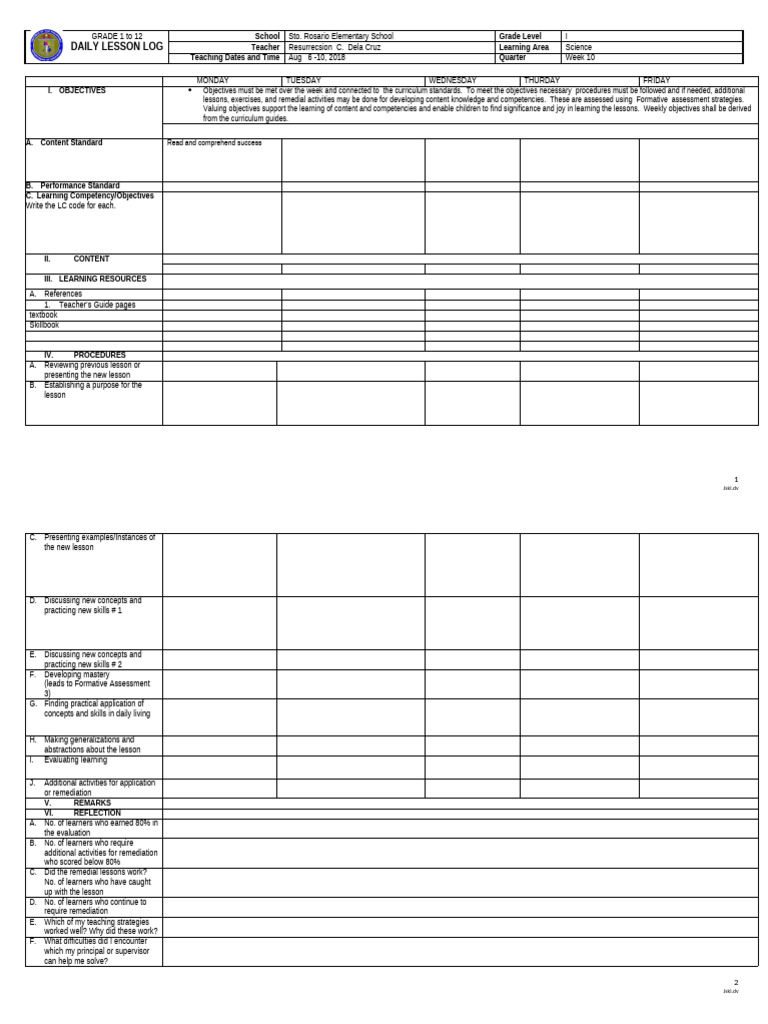 DAILY LESSON LOG Teacher Resurrecsion C. Dela Cruz Learning Area Science