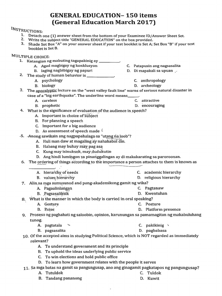 The document contains a set of 150 multiple-choice questions for a General Education exam from March 2017. It covers various subjects including psychology, language, science, and culture, with questions designed to assess knowledge and comprehension in these areas. Instructions for answering the questions and shading the answer sheet are also provided.