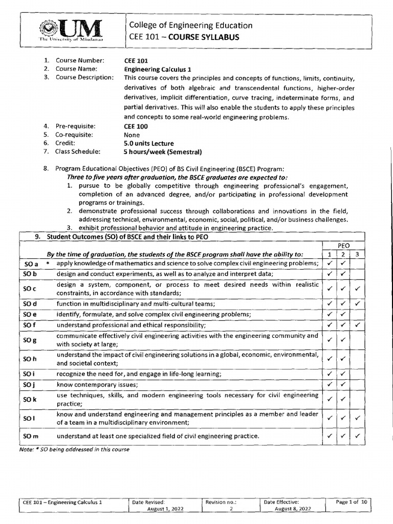 CEE 101, Engineering Calculus 1, is a 5-unit course focusing on functions, limits, derivatives, and their applications in engineering. The course aims to prepare students for real-world engineering problems and aligns with the educational objectives of the BS Civil Engineering program. Students will develop skills in problem-solving, teamwork, and professional ethics, culminating in assessments that cover various calculus concepts.