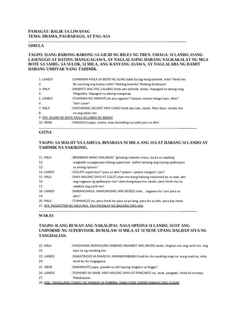 1. LANDO : (UMIINOM MULA SA BOTE NG ALAK) bakit ba lagi kang tahimik, mila? Hindi mo