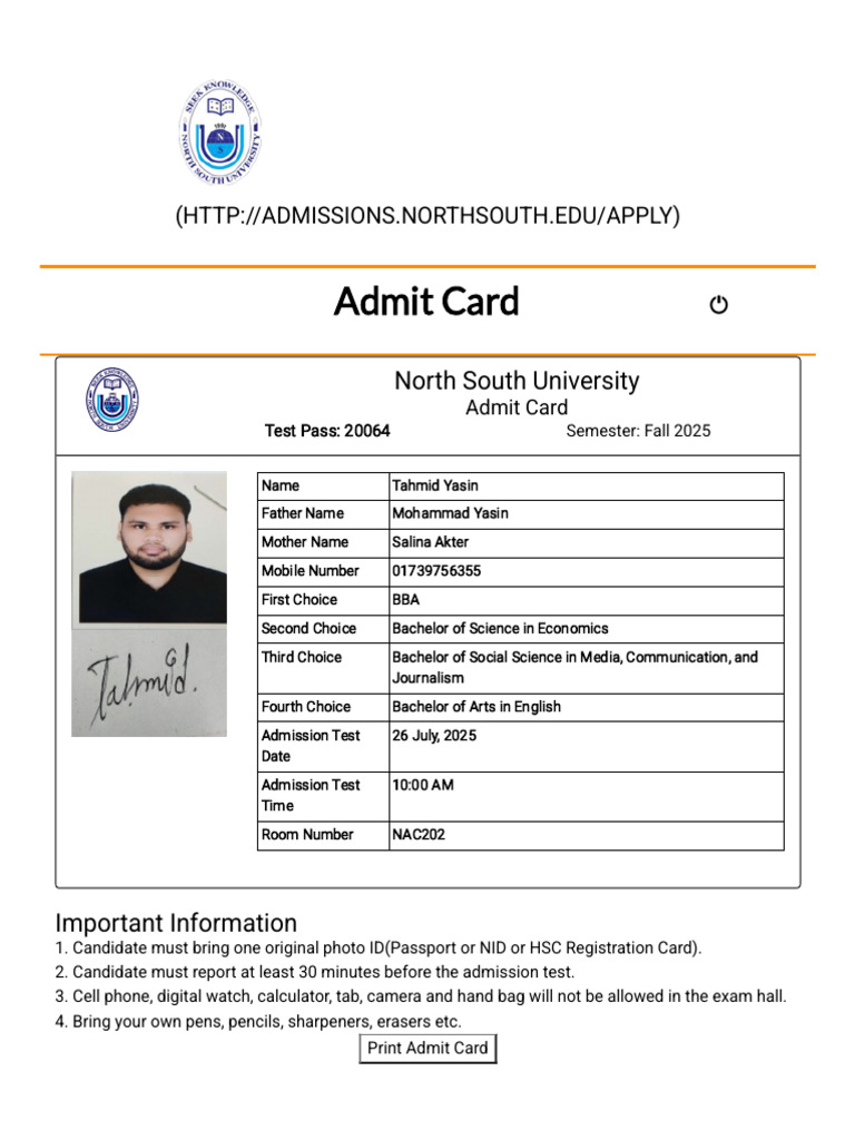 1. Candidate must bring one original photo ID(Passport or NID or HSC Registration Card).