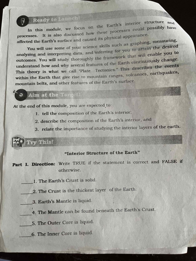 Part I. Direction: Write TRUE if the statement is correct and FALSE if