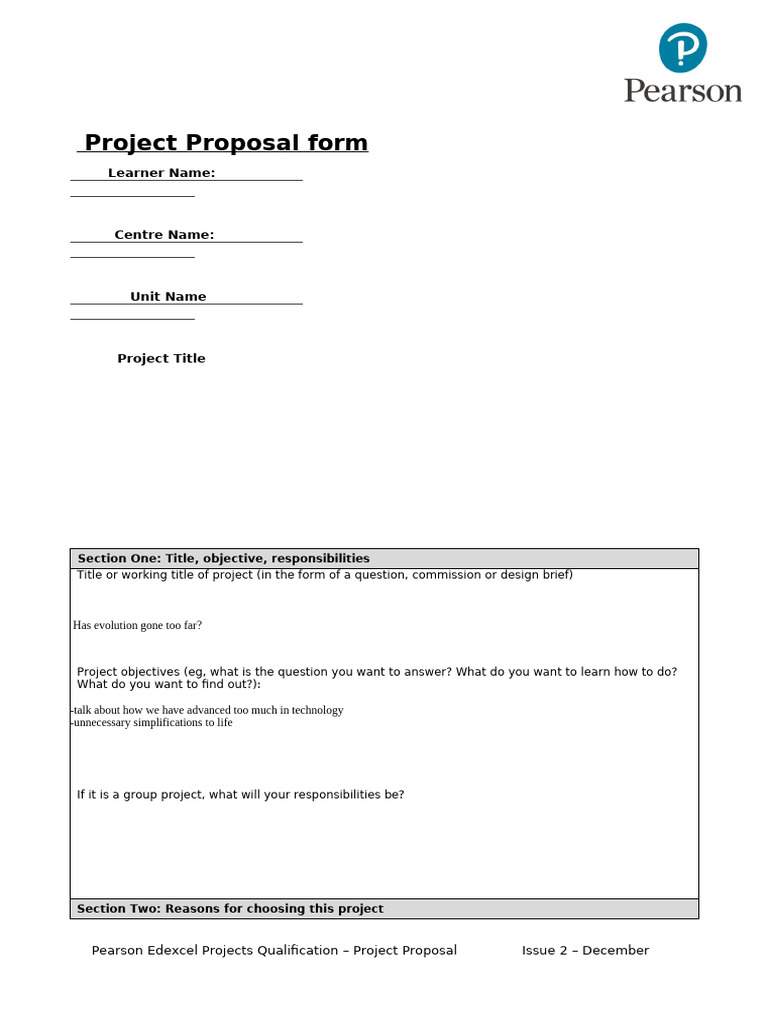 Pearson Edexcel Projects Qualification – Project Proposal Issue 2 – December