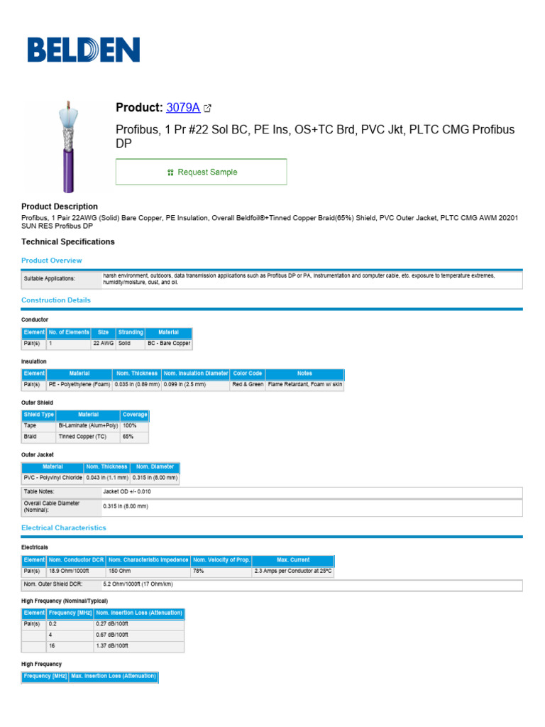 Profibus, 1 Pair 22AWG (Solid) Bare Copper, PE Insulation, Overall Beldfoil®+Tinned Copper Braid(65%) Shield, PVC Outer Jacket, PLTC CMG AWM 20201