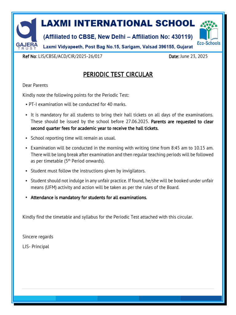 Kindly find the timetable and syllabus for the Periodic Test attached with this circular.