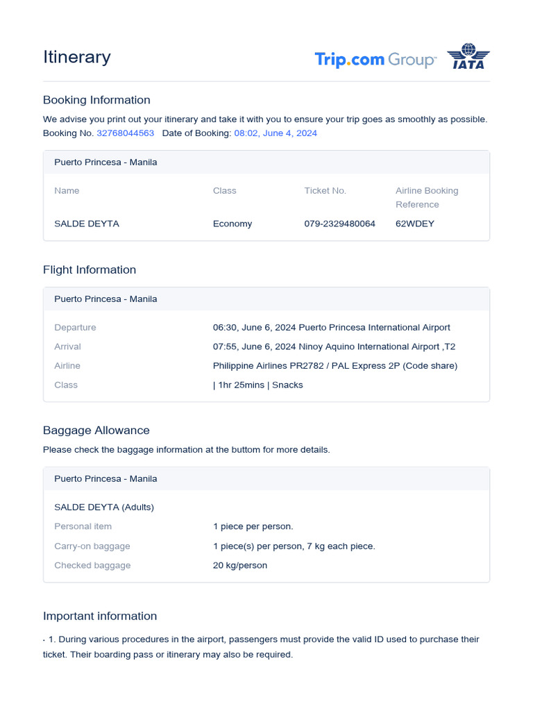 Departure 06:30, June 6, 2024 Puerto Princesa International Airport