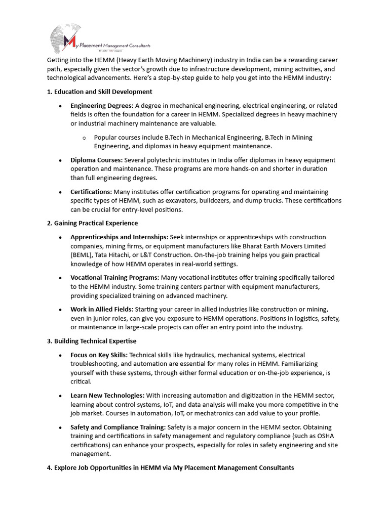 technological advancements. Here’s a step-by-step guide to help you get into the HEMM industry: