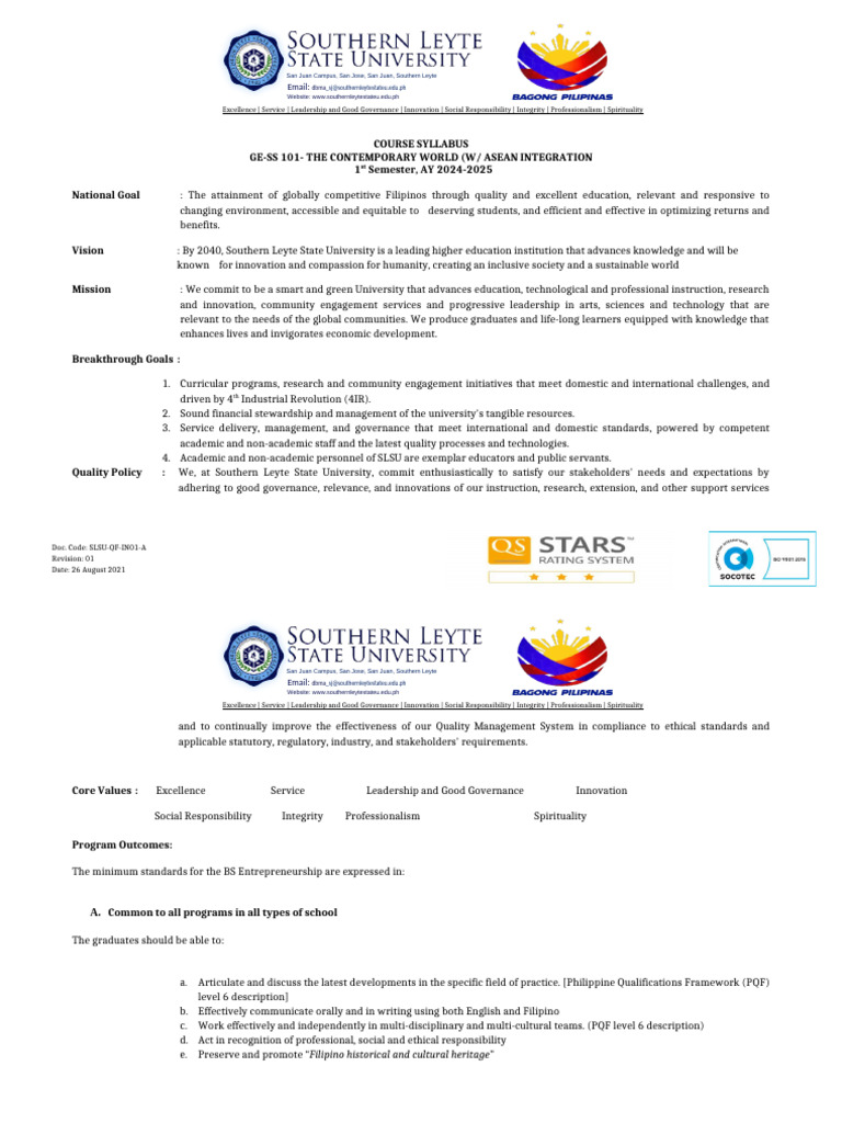 This is to confirm that the contents of the course syllabus in GE_SS 101 The Contemporary World ( W/ ASEAN Integration) 1st semester of AY 2024-
