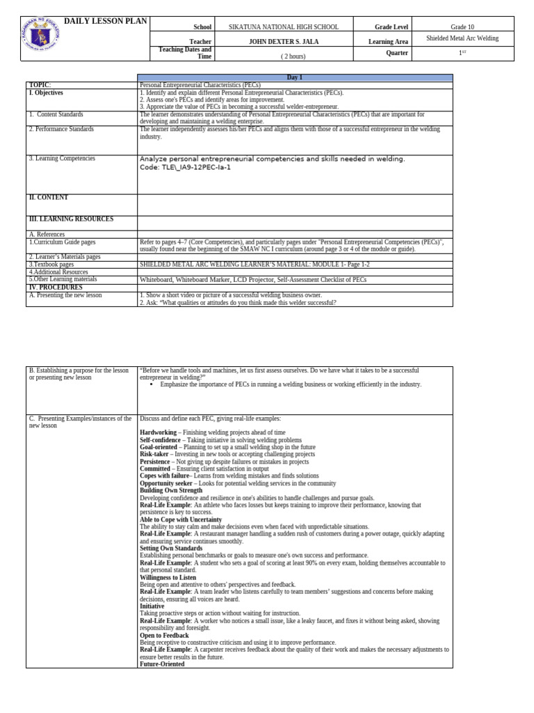 2. Performance Standards The learner independently assesses his/her PECs and aligns them with those of a successful entrepreneur in the welding