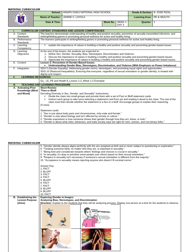 Name of Teacher: JANINE C. LAYOLA Learning Area: PE & HEALTH