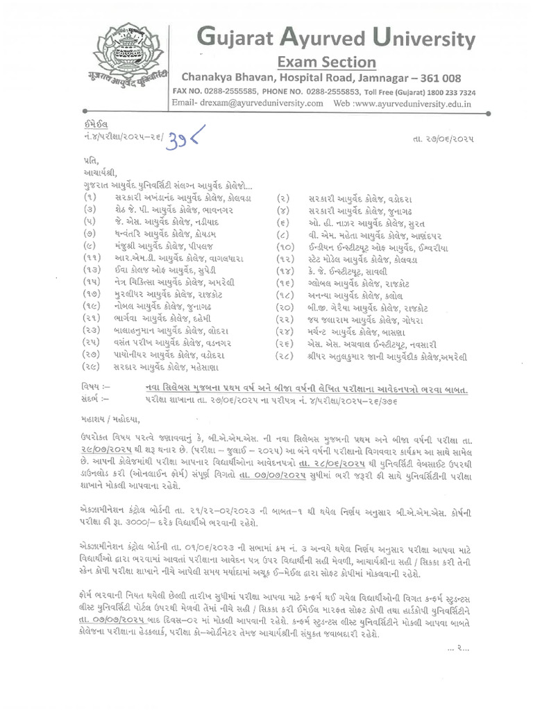 Gujarat Ayurved University has provided details regarding the examination schedule for BAMS first and second-year students, including timings for MCQ and written exams. The document includes contact information for the Exam Section and outlines the subjects for each examination date. The exams are set to take place in July 2025.