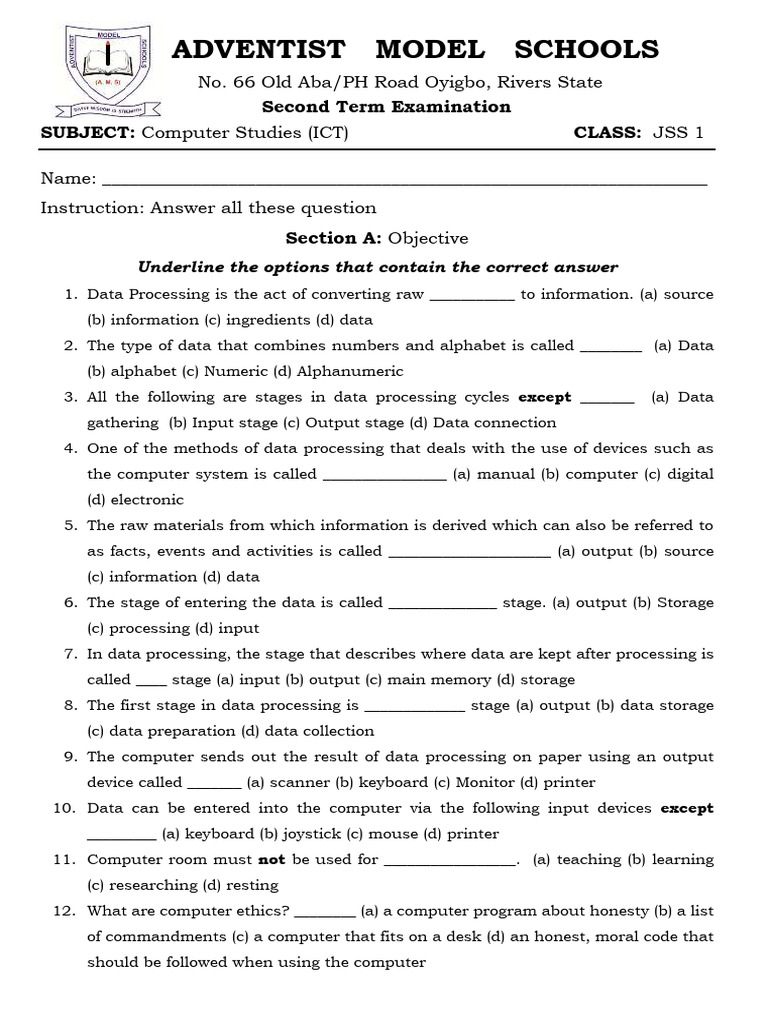SUBJECT: Computer Studies (ICT) CLASS: JSS 1