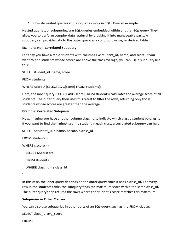 1. How do nested queries and subqueries work in SQL? Give an example.