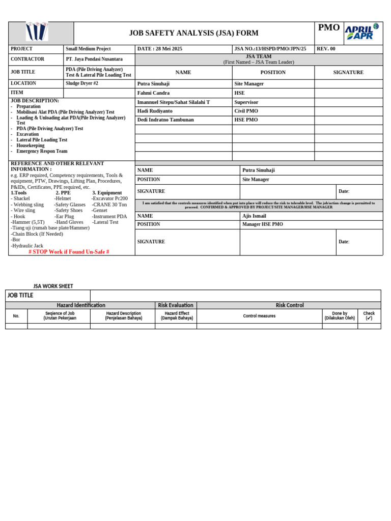 PROJECT Small Medium Project DATE : 28 Mei 2025 JSA NO.:13/HSPD/PMO/JPN/25 REV. 00