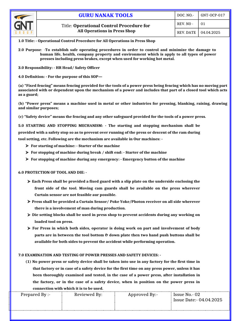 1.0 Title: - Operational Control Procedure for All Operations in Press Shop