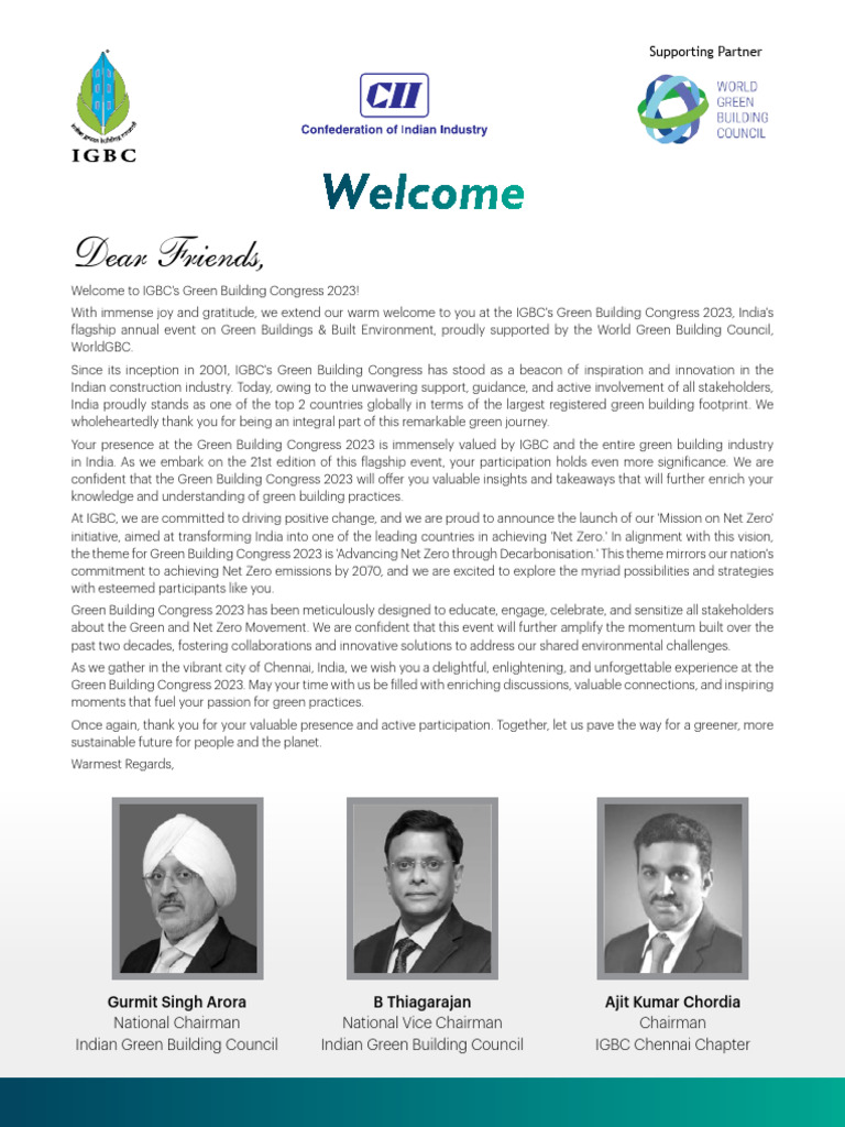 With immense joy and gratitude, we extend our warm welcome to you at the IGBC's Green Building Congress 2023, India's