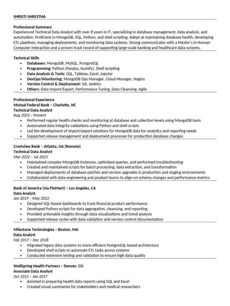 automation. Proficient in MongoDB, SQL, Python, and shell scripting. Adept at maintaining database health, developing
