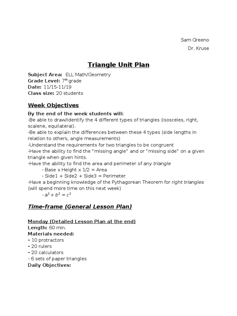 - Understand what makes a triangle a triangle (3 sides, angle sum=180 degrees) - Understand the 4 types of triangles (scalene, isosceles, equilateral, right) - Recognize the differences between these triangles Detailed Procedural Steps for Monday: 1. Step: Bell ringer: What are some examples of triangles? Teachers Role: At the end of the previous class write the bell ringer on the board using words and pictures. Then verbally state the bell ringer. Student Expectations: Answer the bell ringer in their math notebooks (they can write and or draw pictures) Time: 5 minutes 2. Step: Class Discussion Teachers Role: Talk about the bell ringer for a short time. Discuss what makes a triangle and how to compare them to the prior weeks lessons (over four-sided shapes). Then transition into discovering the properties of some of these various triangles. Teacher will have tangible triangles to present also. Students Expectations: Actively participate in discussion about the different types of triangles that are in real world. Time: 10 minutes 3. Step: Class demonstration and student guided practice Teachers Role: Demonstrate that by taking a paper triangle and cutting off the 3 corners then placing them together it will always form a line (aka 180) no matter what the triangle may look like. Student Expectations: Review/Demonstrate math vocab that may not be understood by ELL students by modeling how to measure a side length and how to find measure an angle with a protractor. Show that triangles always have 3 sides and their angles always add up to 180 no matter what the triangle looks like. Time: 5 minutes 4. Step: Class activity Teachers Role: Give students paper-cutouts of the 4 different types of triangles. Each will be labeled with its appropriate name (isosceles, equilateral, scalene, right). Create assigned groups making sure their are varied ranges of intelligence. During the activity the teacher walks around and groups that are struggling help fill in the gaps of their understanding and possibly point out a