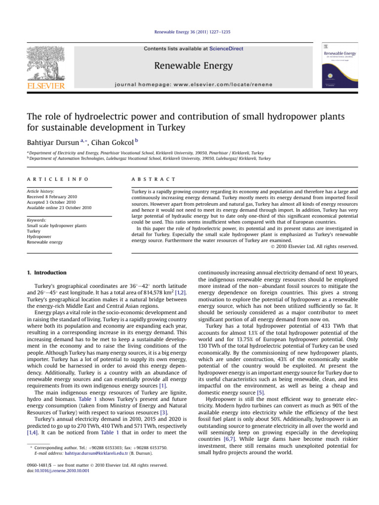 alternative to other sources in Turkey. Energy Policy 2009;37(2):424e31. [23] H.D. Altınbilek, M. Bayram, T. Hazar, The new approach in reservoir induced