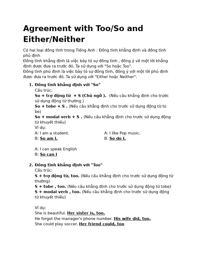 định được đưa ra trước đó. Ta sử dụng với "So hoặc Too".