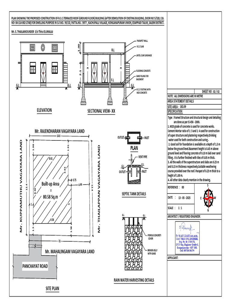 Mr. RAJENDHARAN VAGAYARA LAND Cement Mortar ratio of 1: 3 and 1: 4 used for construction