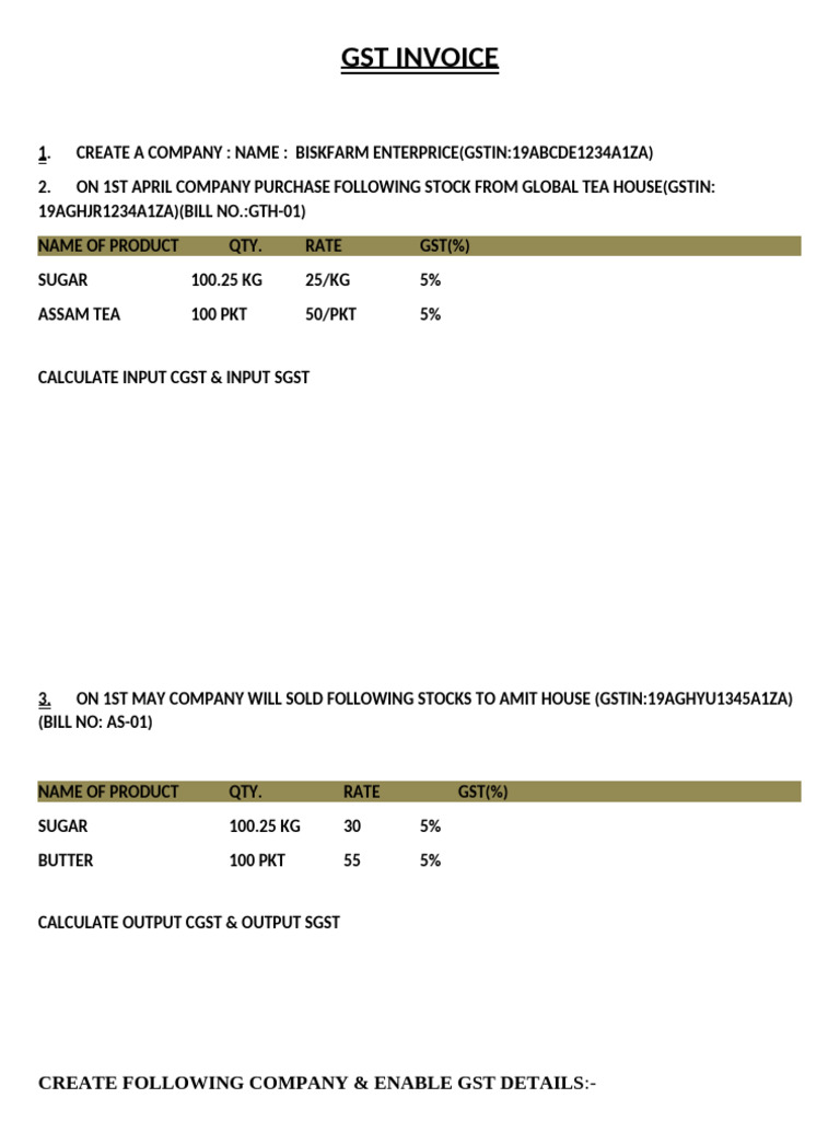 1. CREATE A COMPANY : NAME : BISKFARM ENTERPRICE(GSTIN:19ABCDE1234A1ZA)