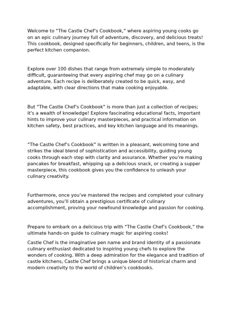 Welcome to “The Castle Chef’s Cookbook,” where aspiring young cooks go