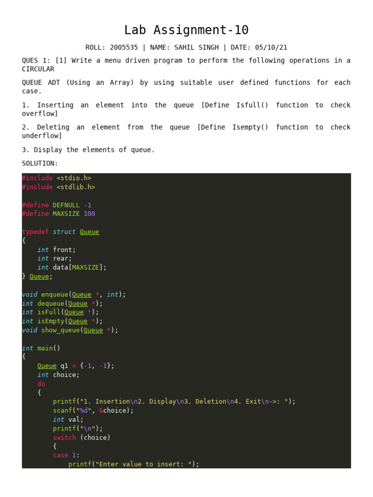 QUEUE ADT (Using an Array) by using suitable user defined functions for each