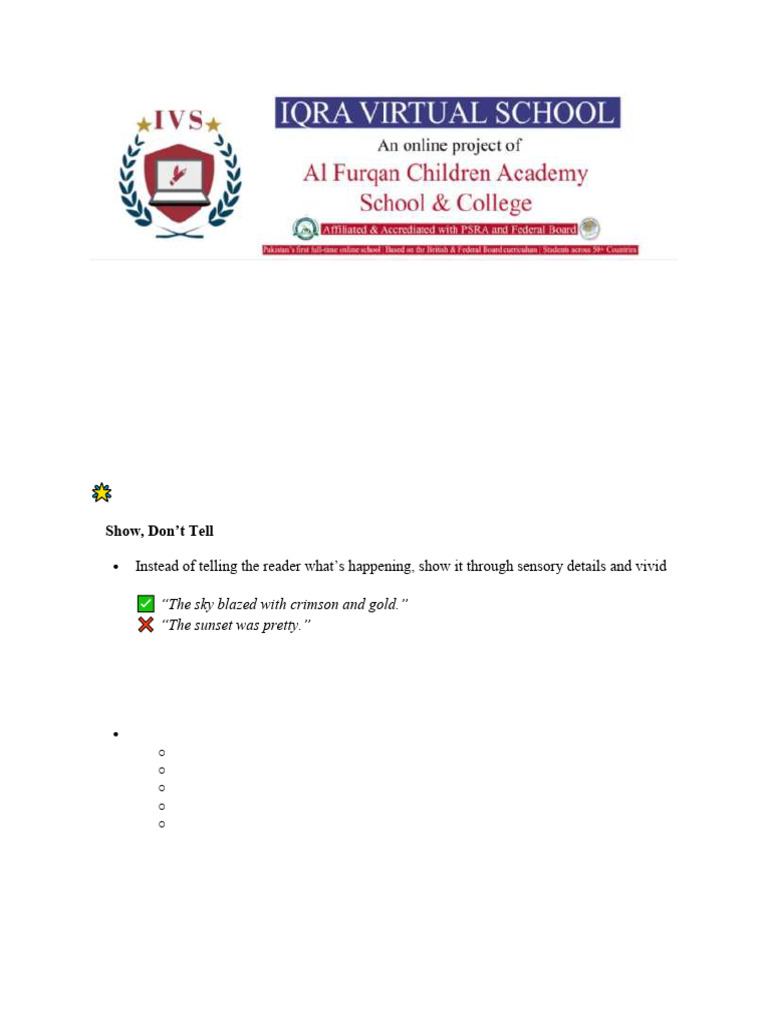 • Instead of telling the reader what’s happening, show it through sensory details and vivid