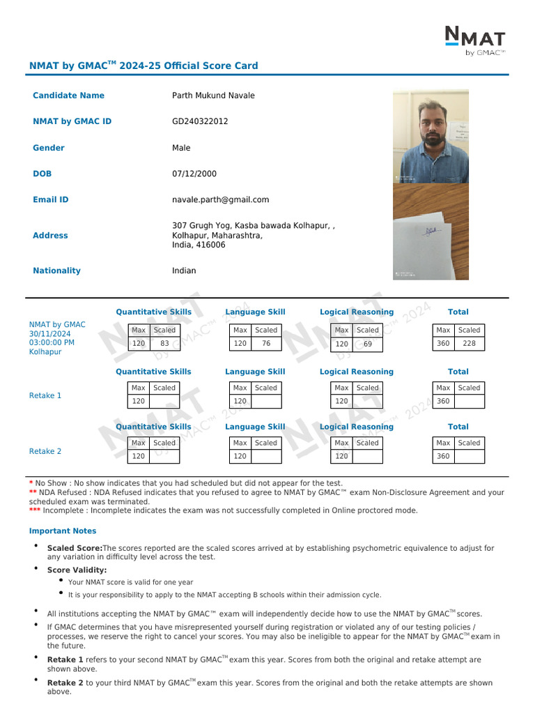 Retake 2 to your third NMAT by GMACTM exam this year. Scores from the original and both the retake attempts are shown