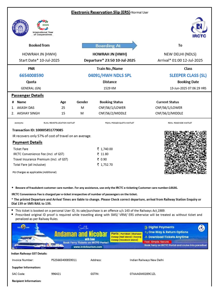 Invoice Number: PS25665400859011 Address: Indian Railways New Delhi