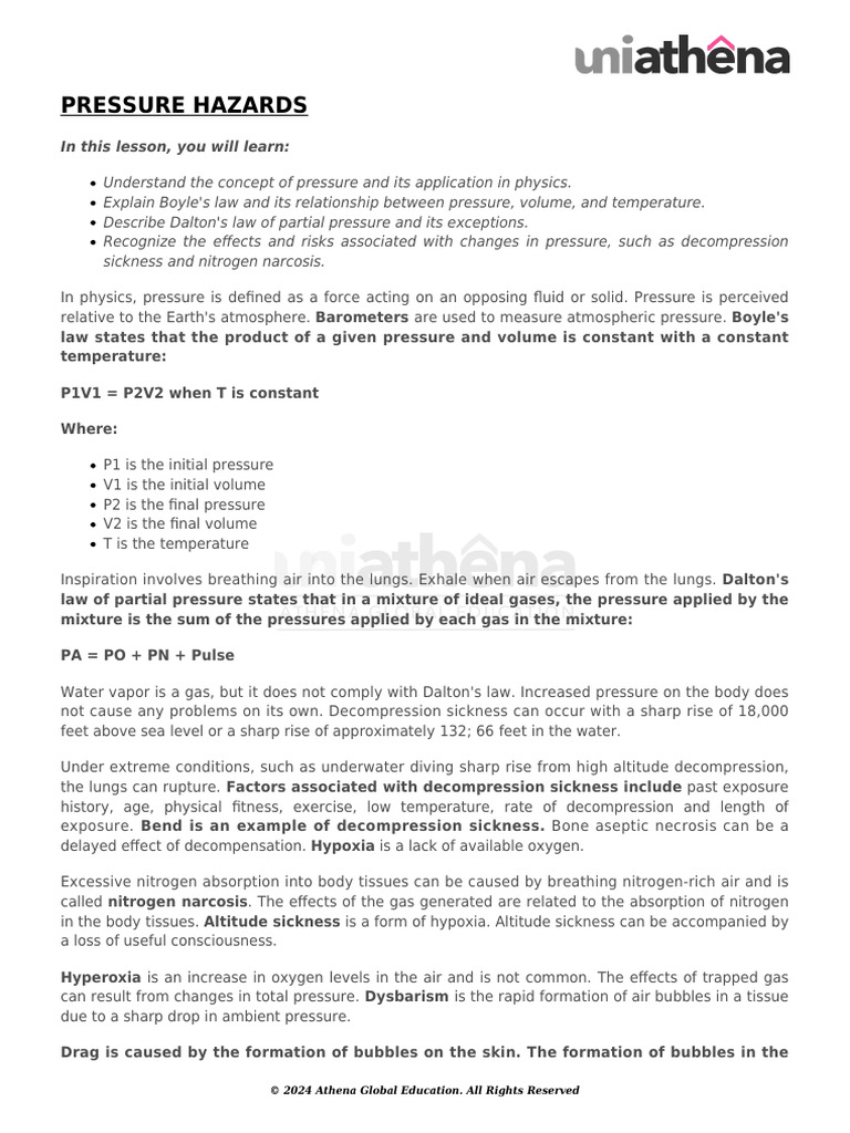 Recognize the effects and risks associated with changes in pressure, such as decompression