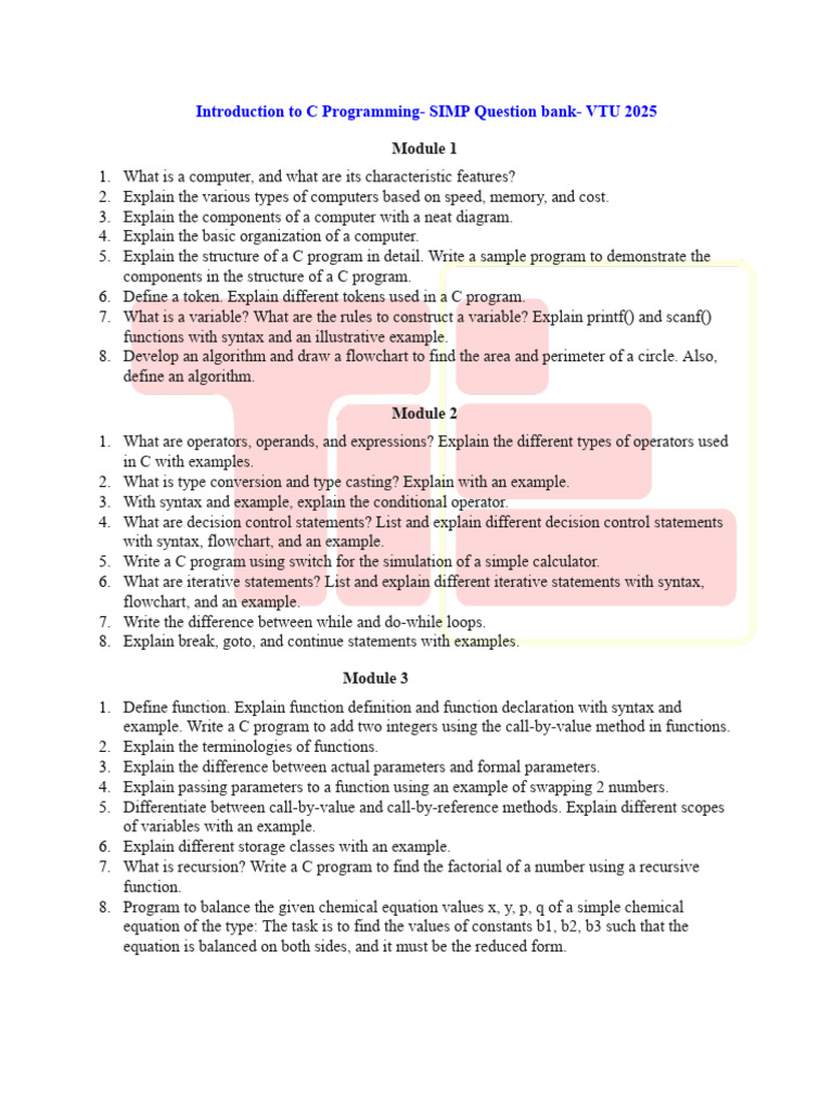 Introduction to C Programming- SIMP Question bank- VTU 2025