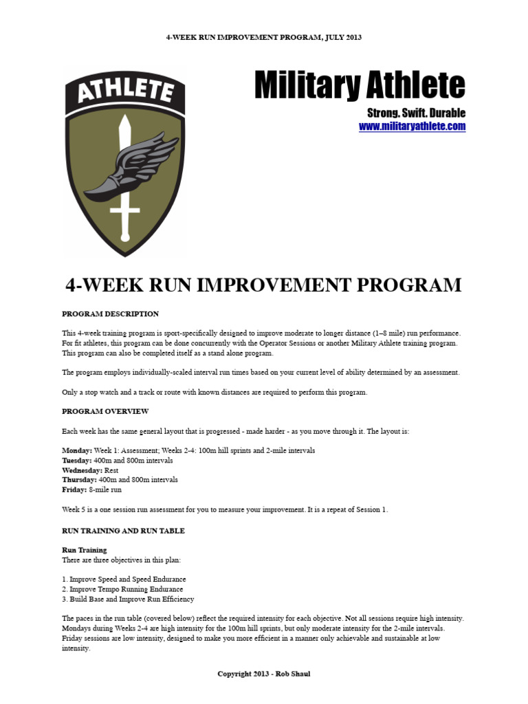 This 4-week training program is sport-specifically designed to improve moderate to longer distance (1–8 mile) run performance.