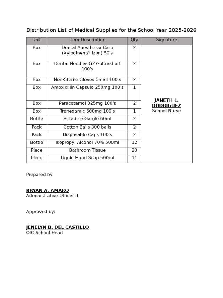 Distribution List of Medical Supplies for the School Year 2025-2026