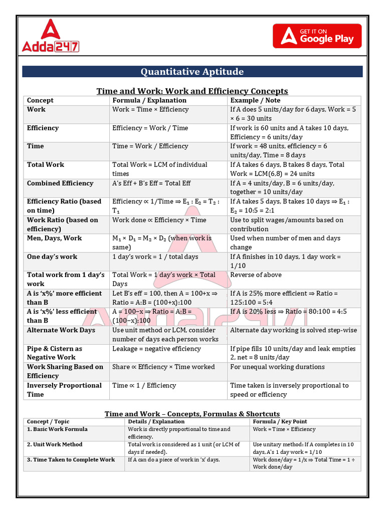 1. Basic Work Formula Work is directly proportional to time and Work = Time × Efficiency