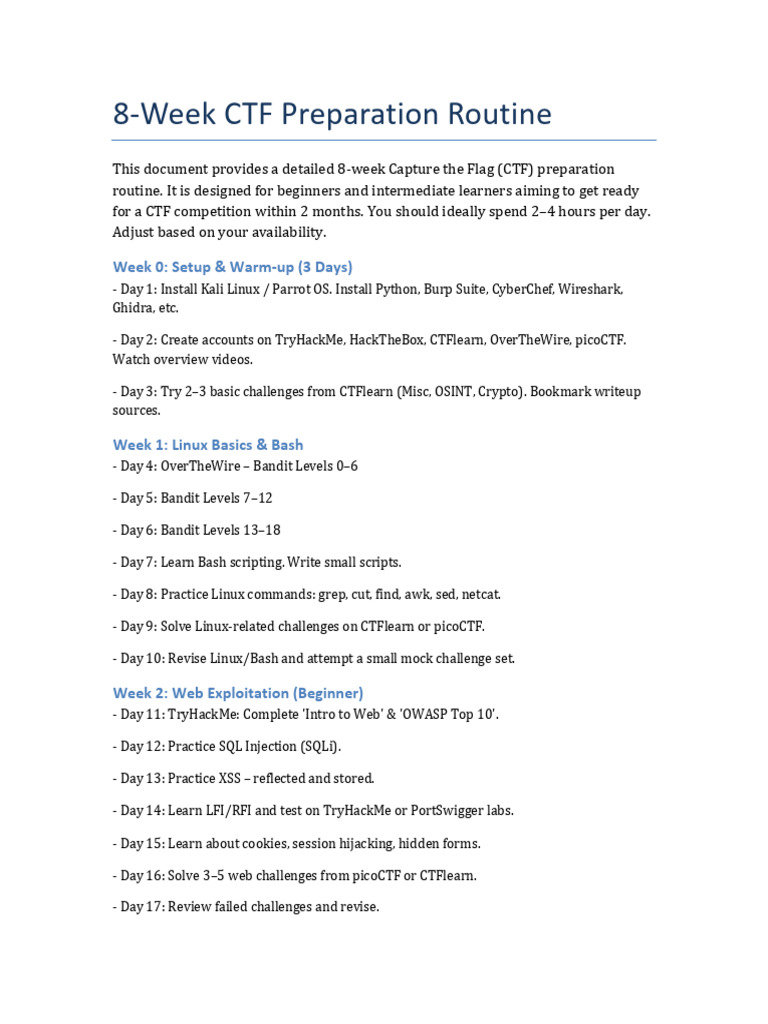 This document provides a detailed 8-week Capture the Flag (CTF) preparation