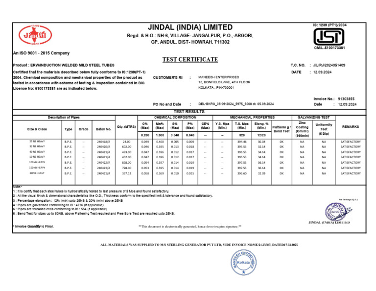 Certified that the materials described below fully conforms to IS:1239(PT-1) DATE : 12.09.2024