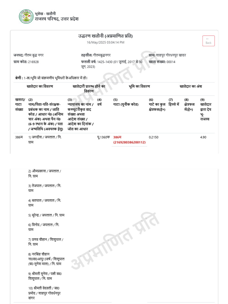 उद्धरण खतौनी (अप्रमाणित प्रति)